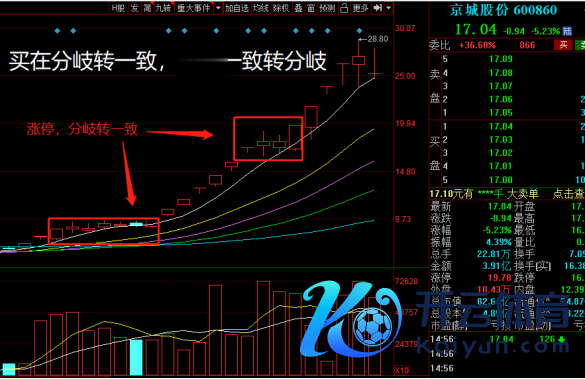 四、咱们再看这一只京城股份,前期的京城,在我框的位置,宇宙有莫得发现,前期皆是出现了涨停,随后走出了一转的中字,惟有翌日某一天,一朝冲破中字的高点,行情将会不息延续,在第二个阶段,相似颐养了两天的一个中字,在第三天的时辰,中字高点被冲破,是以宇宙一定要记取一句话,买在分岐转一致,卖在一致转分岐,这是往常的妙手浓缩出来的中枢谈话。